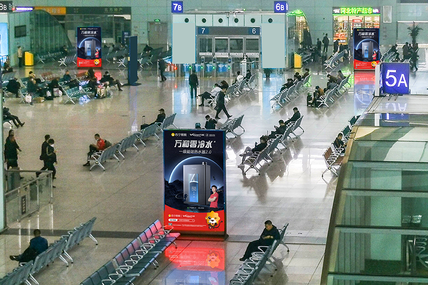 兆訊傳媒精研旅客行徑動線,以最優(yōu)規(guī)劃布局石家莊站內(nèi)媒體,鎖定旅客停留時間最長的黃金候車場景,憑借超長時間媒體接觸提升品牌曝光機會。135英寸雙面LED刷屏以趨于旅客平視角度的最佳收看視角,將品牌畫面信息盡數(shù)呈現(xiàn),同時配合矩陣式平行排列布局,構(gòu)建“零距離”品牌沉浸空間。