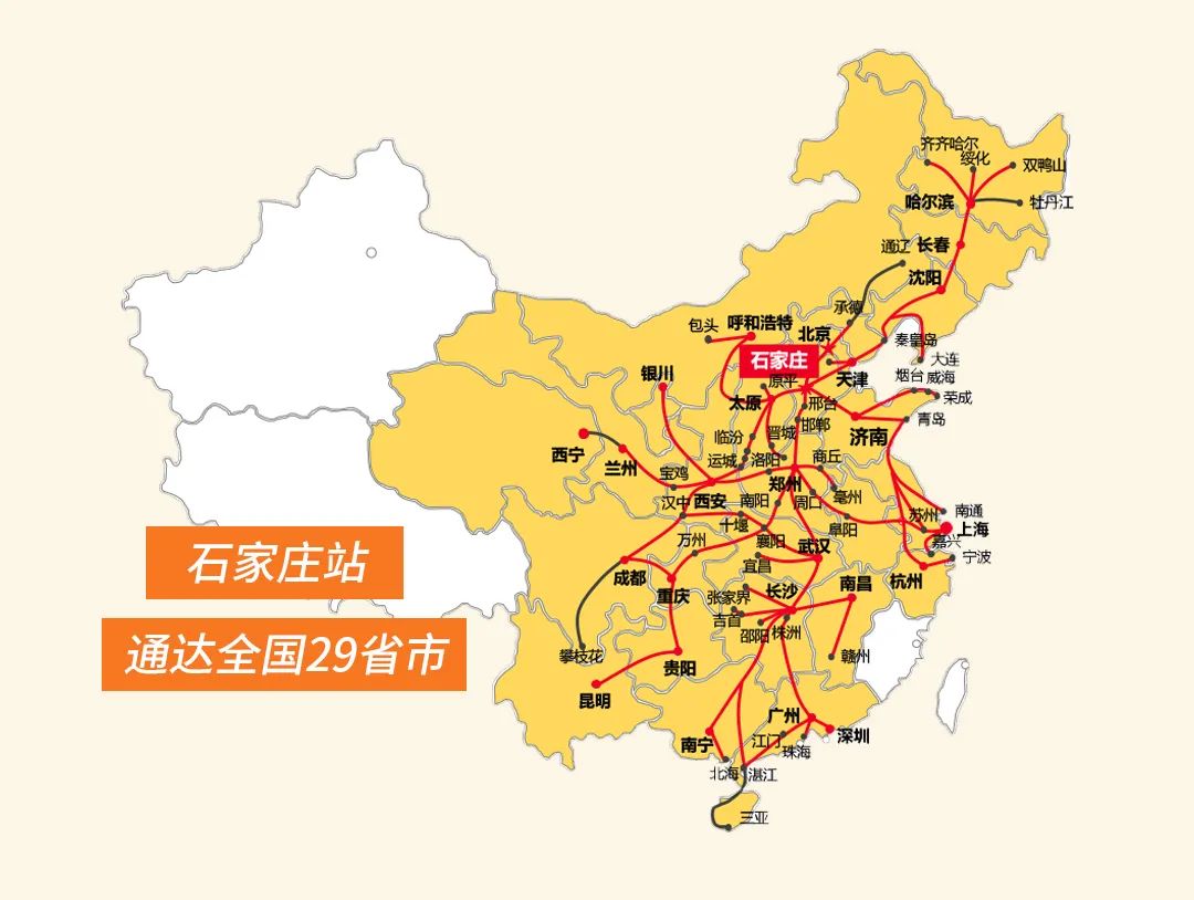 老站新線,咽喉要道,石家莊站同時引進京廣高速鐵路和京廣普速鐵路,對石家莊城市的鐵路發(fā)展道路起到無可比擬的推動作用。這座河北省最繁忙的車站,在區(qū)域協(xié)同發(fā)展的利好趨勢下,京津冀鐵路網(wǎng)絡交通樞紐地位愈發(fā)顯著,四通八達的鐵路網(wǎng)將石家莊與周邊區(qū)域緊密相連,群眾乘坐高鐵出行當天即可到達全國各地主要城市,石家莊的“高鐵朋友圈”正在不斷發(fā)展壯大。