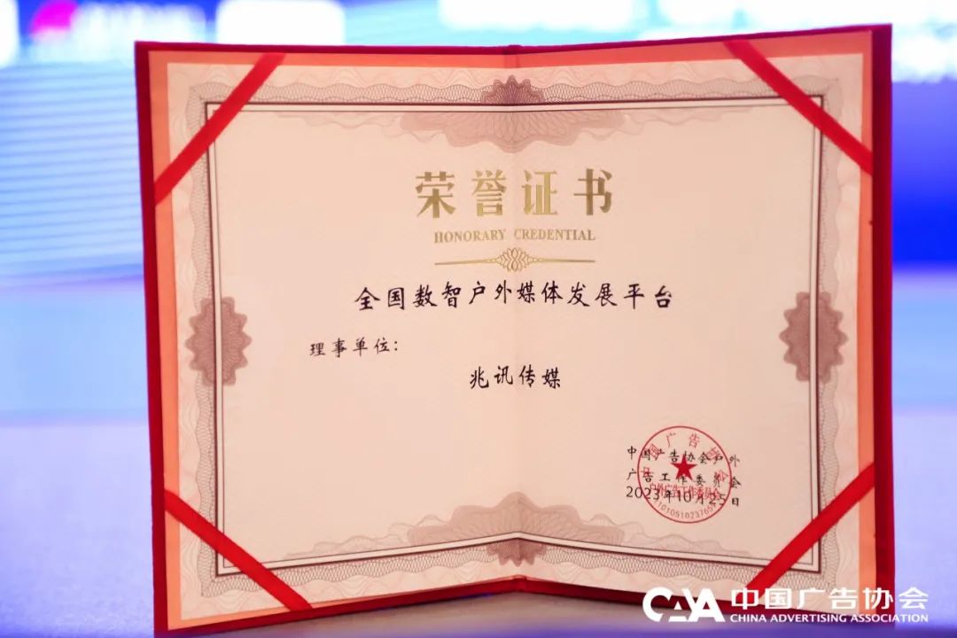 會議期間,2023年度“戶外廣告優質媒體”、“城市地標廣告媒體”、“益世紀錄(2023)中國戶外廣告之最”評選榜單重磅揭曉。兆訊傳媒憑借行業領先的媒體資源優勢,榮攬“城市地標廣告媒體”(廣州、太原、貴陽、成都、重慶、北京六地)、“中國戶外廣告之最:全國高鐵站核心候車區數字媒體數量最多”、“戶外廣告交通場景類優質媒體”三類獎項認證。