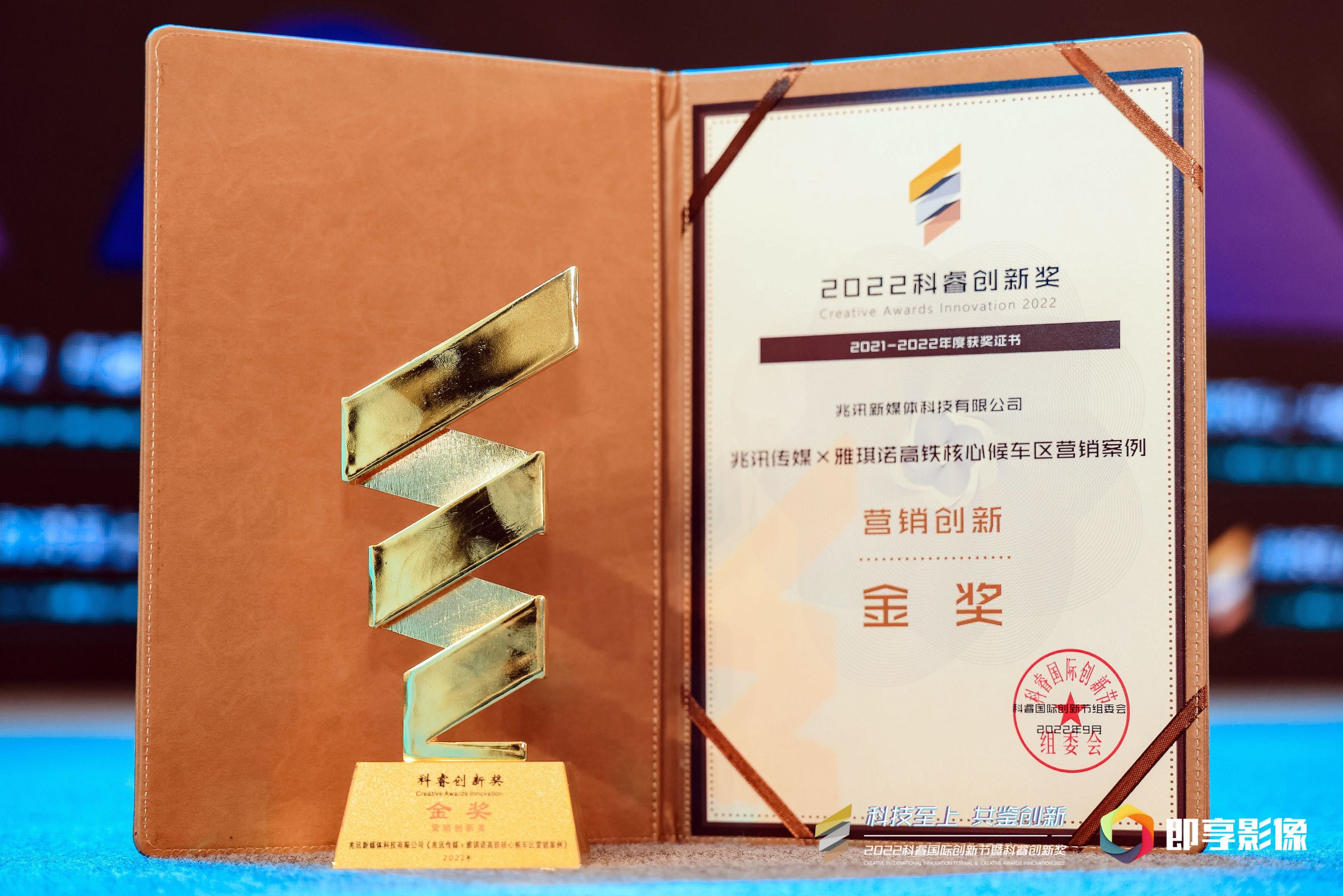 2022年9月21日,以“科技向上,共鑒創(chuàng)新”為主題的科睿國(guó)際創(chuàng)新節(jié)暨第七屆科睿創(chuàng)新獎(jiǎng)?lì)C獎(jiǎng)盛典在京舉行。兆訊傳媒憑借領(lǐng)先的鐵路數(shù)字媒體運(yùn)營(yíng)能力以及強(qiáng)大的品牌傳播能力,以“兆訊傳媒×雅琪諾高鐵核心候車區(qū)營(yíng)銷案例” 再度斬獲科睿營(yíng)銷創(chuàng)新金獎(jiǎng)。